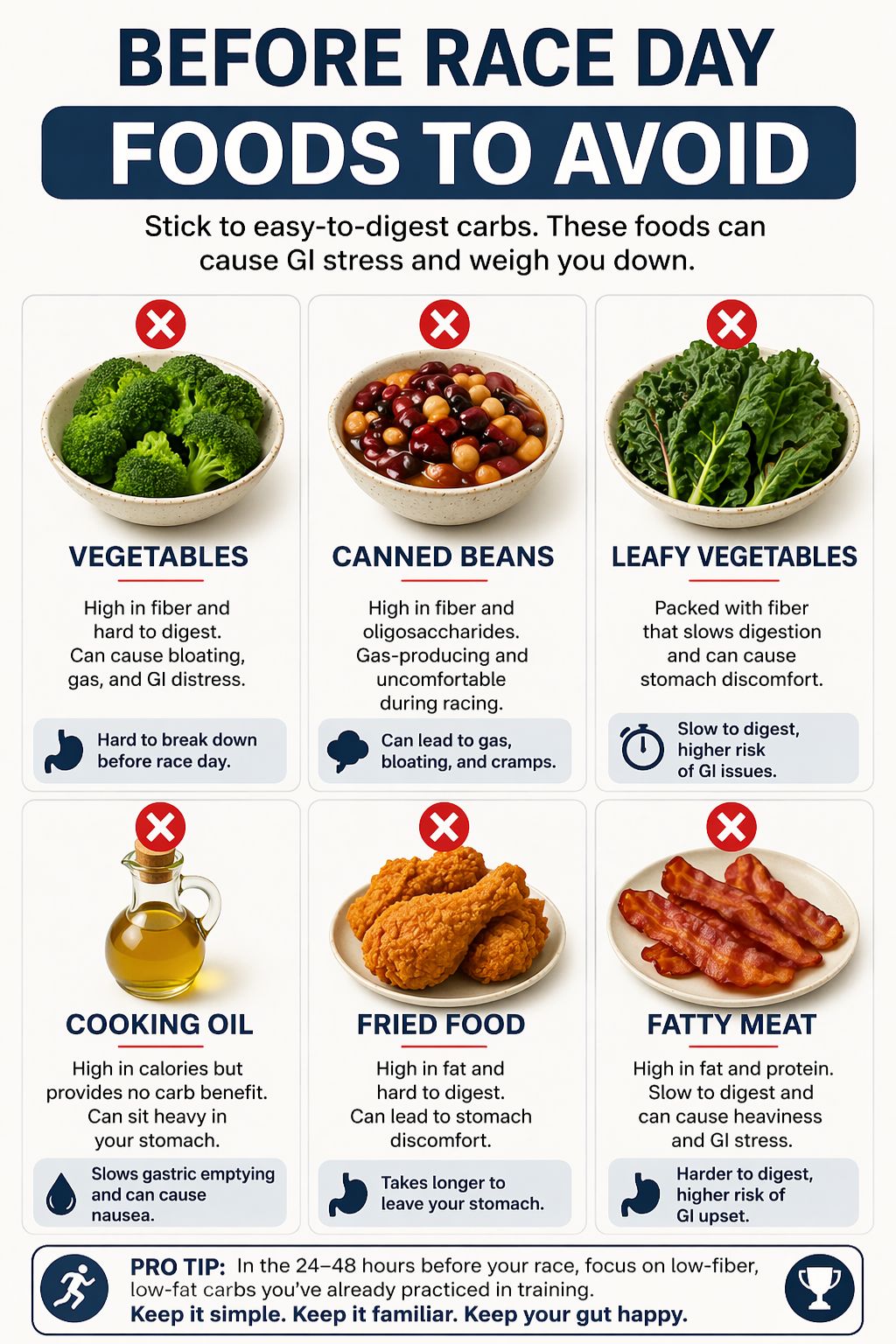 Skip fiber and fat for 48 hours. They slow digestion and crowd out the carbs you actually need.