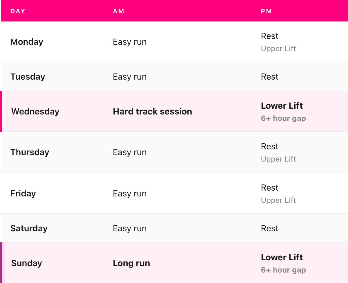 Hard days stay hard. Easy days stay easy. Two lifts per week, both after the sessions that matter most.