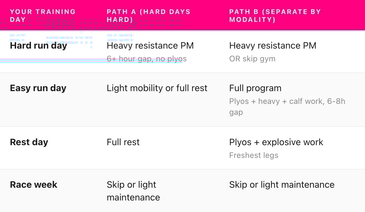 Two paths, both valid. Stack hard days together (Path A) or separate plyos from hard runs (Path B). Your schedule decides.